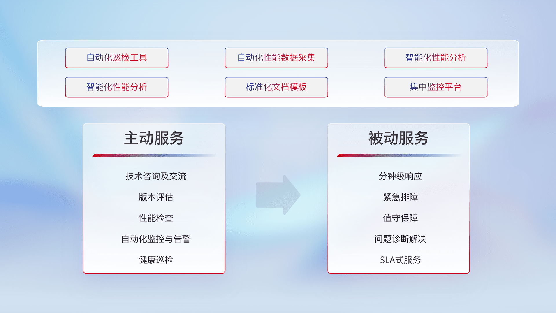 智能化工具和标准化文档,,,,保障服务质量,,,,提供主动服务(包含技术咨询、、、、版本评估、、性能检查、、、自动化监控与告警、、、、健康巡检)和被动服务包含(分钟级响应、、紧急排障、、值守保障、、、、问题诊断解决、、、、SLA服务)。。。