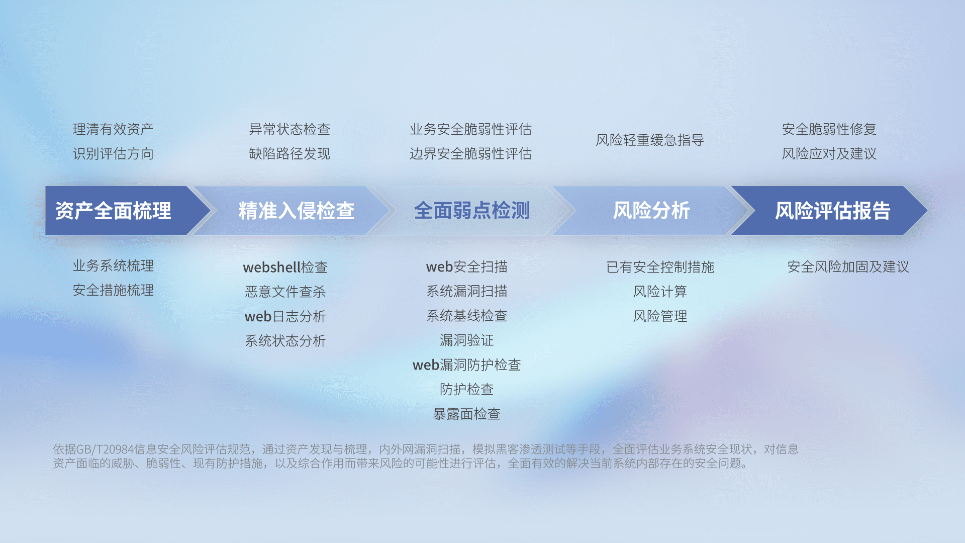 针对客户行业特性,,,以专业的安全服务+多厂商联合解决方案提供专属的一站式安全管理服务,,,,帮助客户全面感知网络空间威胁,,,,基于识别、、、、检测、、分析、、防护、、监测、、、响应的服务理论模型,,,,从方案咨询、、集成交付、、、、评估验证、、、、优化加固、、运维运营,,,,致力于为客户提供完整的闭环管理式安全服务。。以实战经验为客户打造高抵御风险的安全体系,,,帮助客户发现威胁、、对抗威胁、、处置威胁,,,,不断积累安全对抗能力,,,,持续保障数字化安全。。。